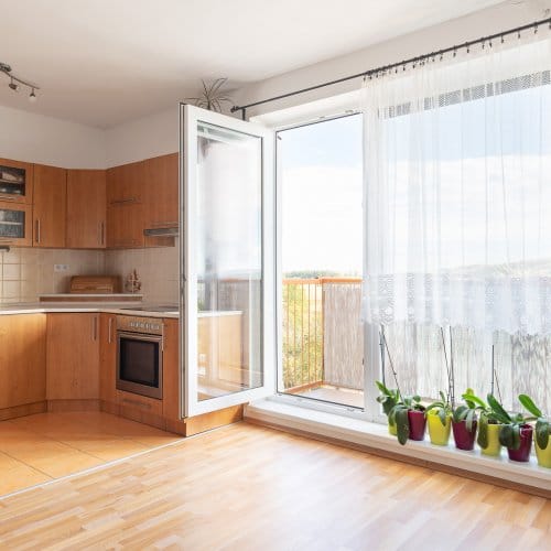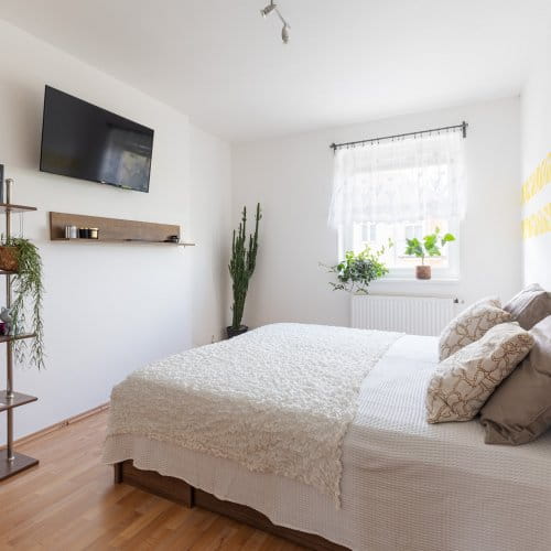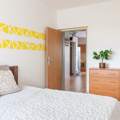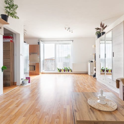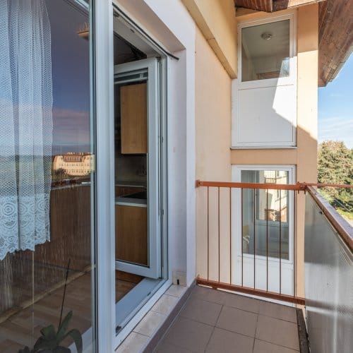 Výměry: obývací pokoj 26 m2, kuchyně 5,2 m2, ložnice 14 m2, balkon 3,4 m2.