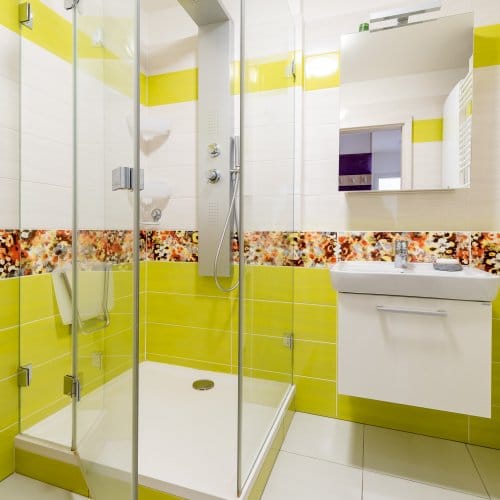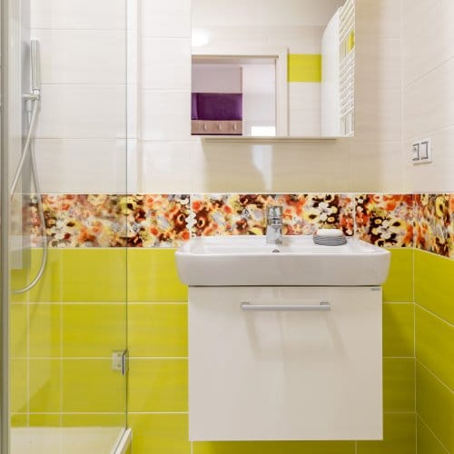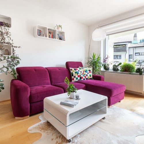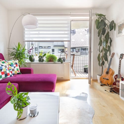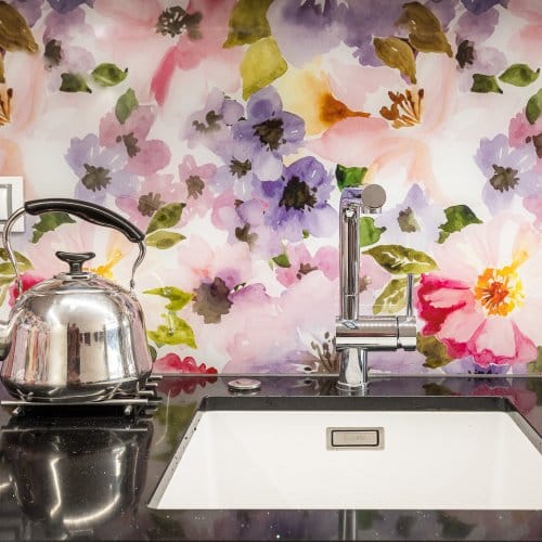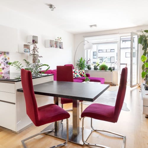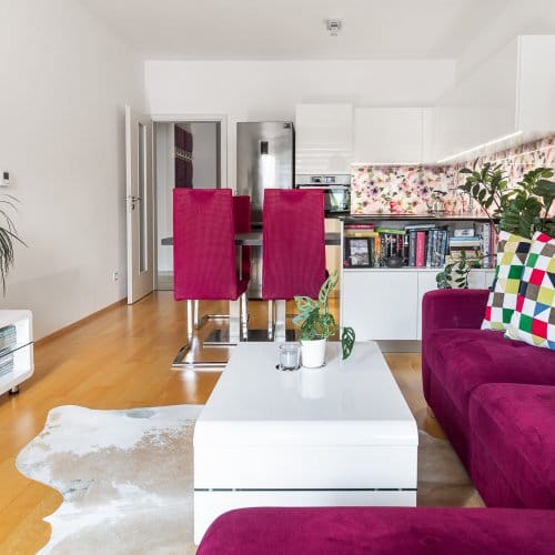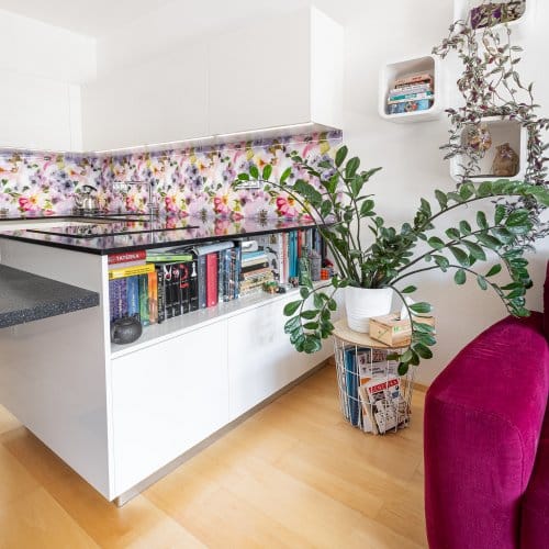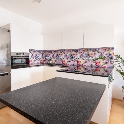 Kuchyňskému koutu a obývacímu pokoji vévodí neotřelý design. Kuchyňská linka byla vyrobená na míru renomovaným studiem Hanák. Třešničkou pro znalce je pracovní deska z technického kamene – tedy beze spár. Kromě pestrobarevného skleněného obkladu, který nemůžete přehlédnout, vyniká kuchyňská linka minimalistickým vzhledem i důmyslně řešeným úložným systémem.