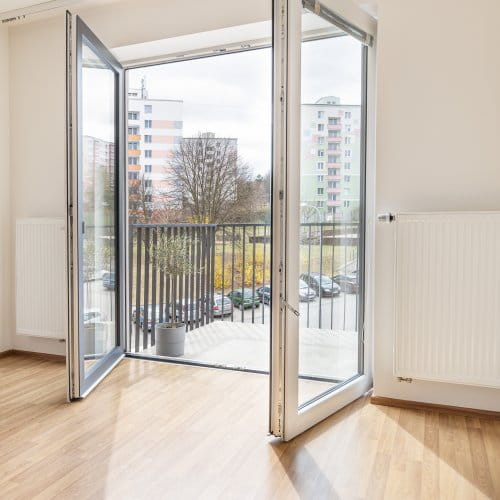 Obě místnosti jsou orientované k jihu. Výhled je poměrně hodně otevřený, díváte se do prostoru za domem, kde kromě parkoviště jsou zde i vzrostlé stromy, soukromý pozemek s lavičkami.