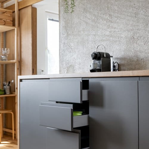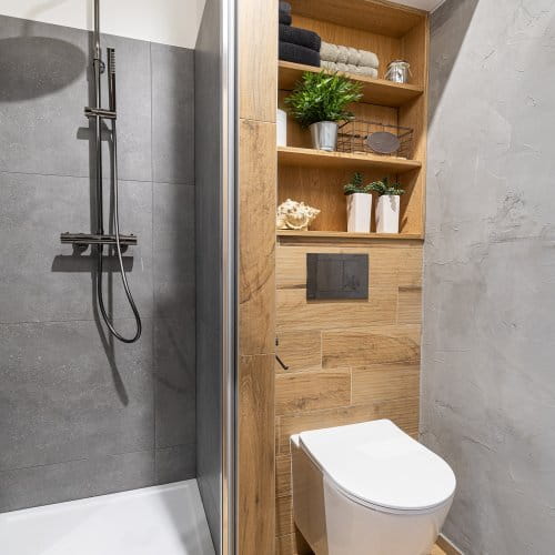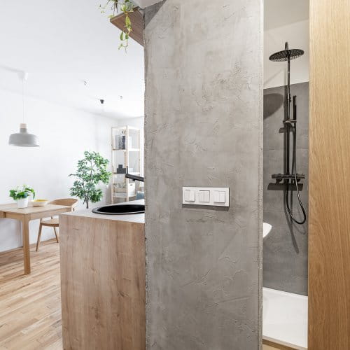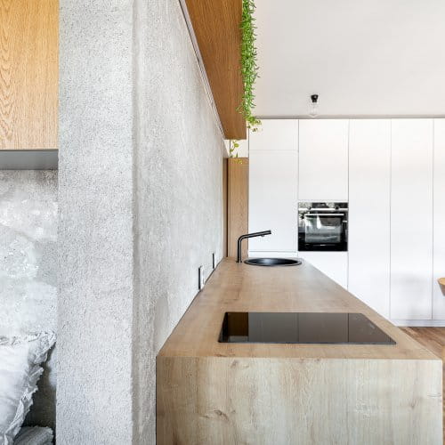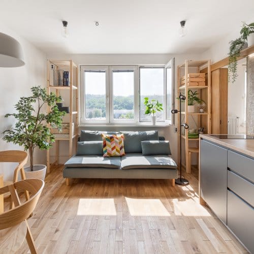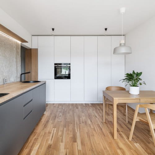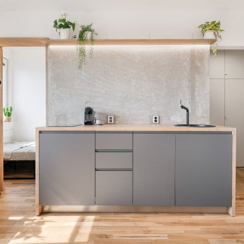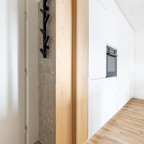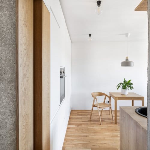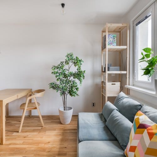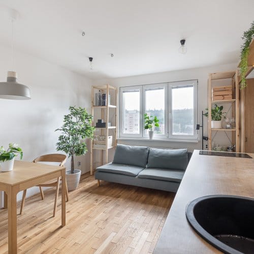Svět interiérového designu zasahují různé módní vlny, na jednu věc ale můžete vzít jed: dřevo z módy nikdy nevyjde. Hřeje, zútulňuje a baví zároveň. I proto vévodí našemu bytu 2+kk na ulici Vídeňská. Na výbavě se zde opravdu nešetřilo. Dřevo je na zemi, dveřích, nábytku i v detailech. Žádná nuda a šeď! A to i když zde šedá představuje hned druhou nejčastější barvu.
