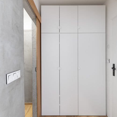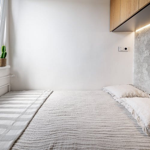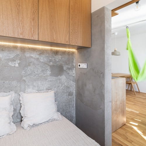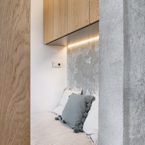 Díky návrhu architekta je byt perfektně promyšlený. Vestavěné skříně nabízí dostatek prostoru k uložení všech nezbytný věcí, aniž by tím bytu ubíraly na vzdušnosti. Můžete si zde zacvičit jógu nebo pokoj proměnit v kino. Nesnažili jsme se maskovat, že se jedná o byt v paneláku. Naopak. Přiznali jsme to. Nevšední struktura očištěné betonové zdi vynikne díky nasvícení LED pásky.
