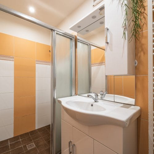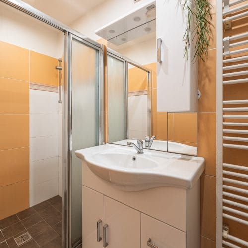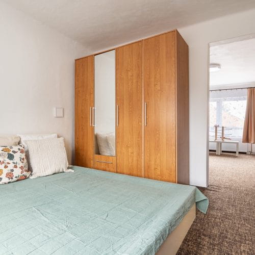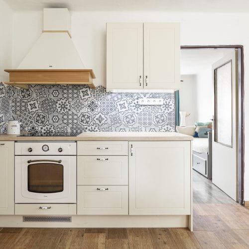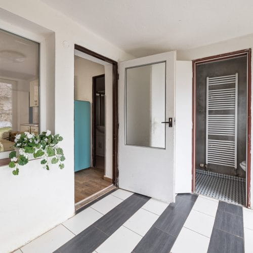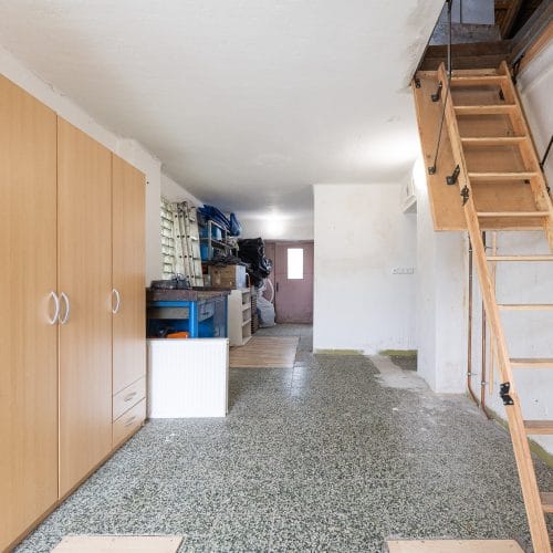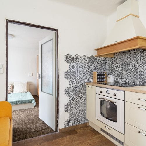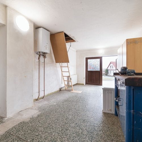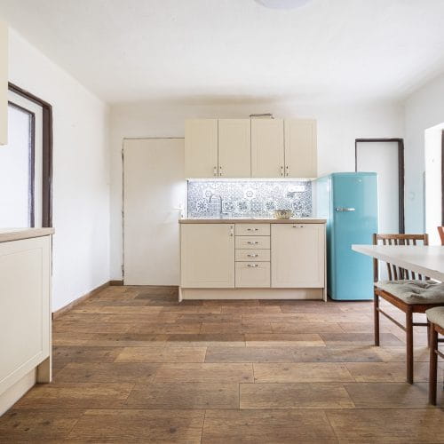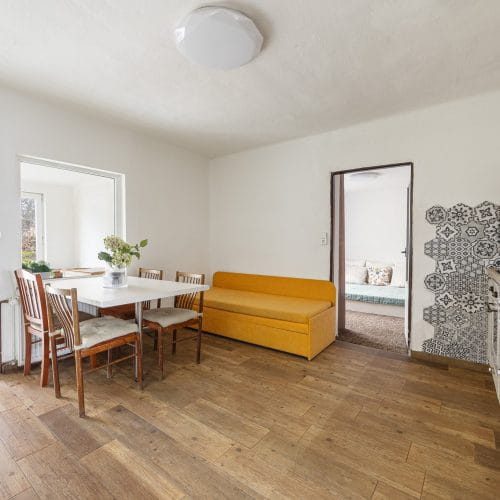 Původní vjezd je nyní upraven na vstupní (podsklepenou) chodbu, která funguje jako místo pro ukládání věcí nebo jako dílny. Uvnitř domu jsou tři pokoje (dva z toho průchozí), ložnice je orientovaná směrem do zahrady, což je velká výhoda pro ty, kteří rádi vstávají s výhledem do zeleně. Přistavěná prosklená veranda může fungovat případně jako zimní zahrada. Obytná kuchyň je prostorná, bez problému se sem vejde i stůl pro velkou rodinu nebo kupu kamarádů o víkendové návštěvě. Kuchyňská linka je nová, stylem zcela zapadá do venkovského stavení, zahrnuje i myčku a indukční desku. Sečteno a podtrženo, hladem zde rozhodně neumřete. Bonusem pro kulináře je samostatná spíž. Obytnou plochu je teoreticky možné rozšířit o podkroví.
