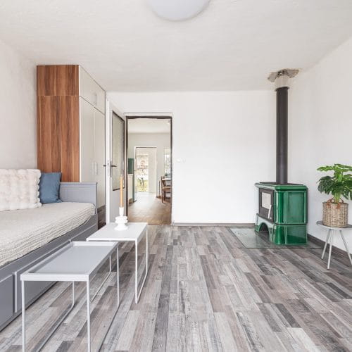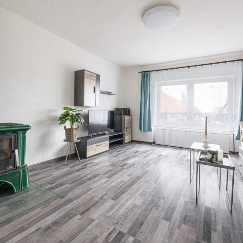 Dům prošel částečnou rekonstrukcí v r. 2021. Od té doby jsou v kuchyni a v obývacím pokoji nové podlahy a v celém domě pak nové elektrické rozvody (dva tarify). Krbová kamna s novým nerezovým komínem v obývacím pokoji zvládnou vytopit celý dům, čímž můžete znatelně snížit náklady na bydlení. V ložnici a pokoji jsou původní parkety přikryté kobercem, ty by nejspíš bylo možné ošetřit a zachovat.