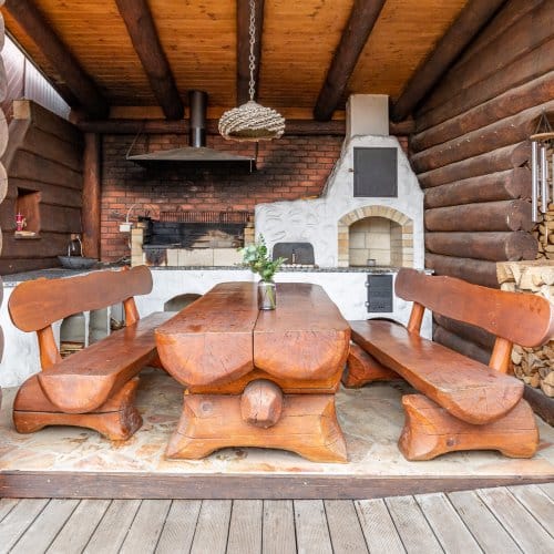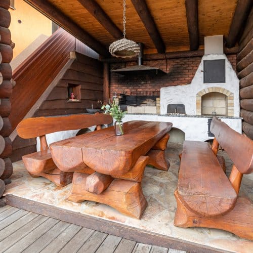 srub s venkovní kuchyní grilem a udírnou