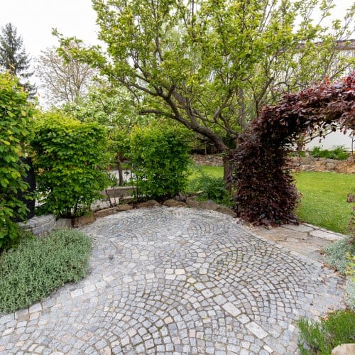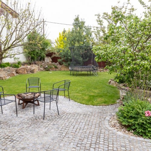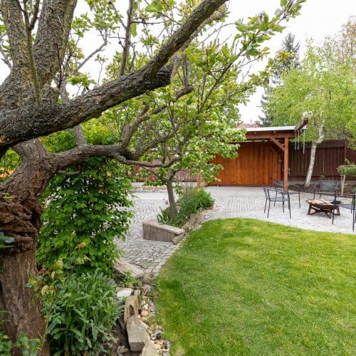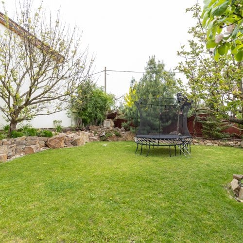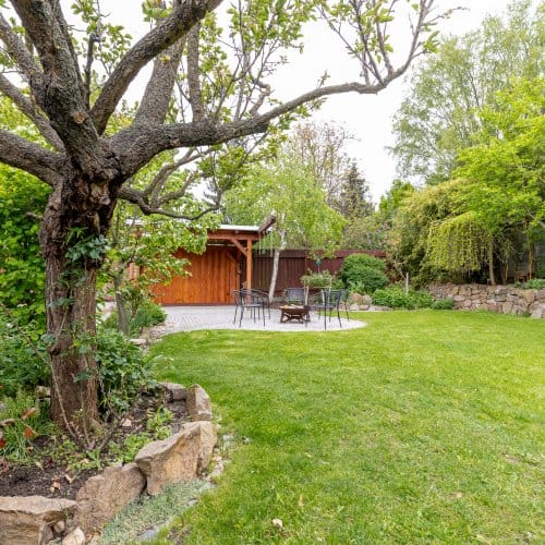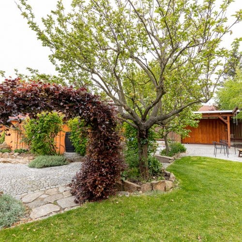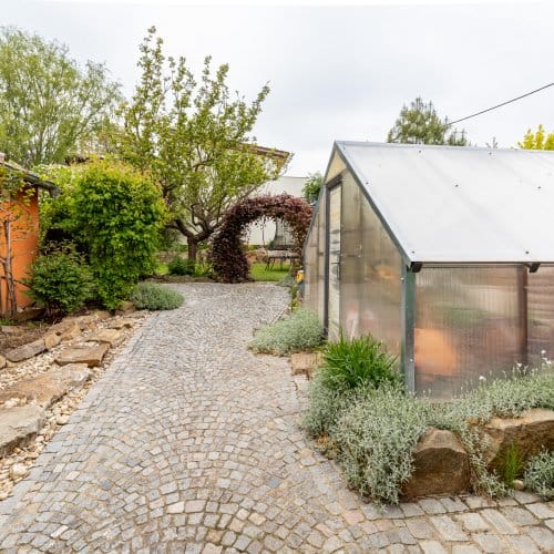 Začněme na zahradě. Zatímco u novostavby trvá pár let, než začne zahrada vypadat trochu k světu, tahle je ‚‚hotová‘‘. Nečekají vás zásadní úpravy, pouze údržba a těšení se na vlastní meruňky, kdoule, švestky, jablka, borůvky, jahody, maliny nebo rybíz. Co nestačíte sníst přes léto, to může skončit v mrazáku nebo v marmeládě. Zkrátka takové ty malé velké radosti, o kterých si člověk bez zahrady může nechat zdát. Potěšení z pěstění nezačíná ani nekončí s letní sezónou, a sice díky skleníku se závlahou, s kterým se můžete zásobit čerstvou zeleninou i na podzim.