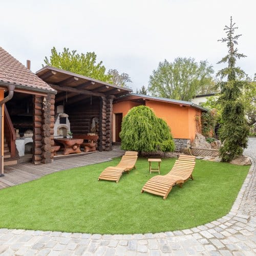 Samostatnou zmínku si zaslouží srub s venkovní kuchyní, udírnou, grilem, pecí na pizzu a rožněm na kýtu. Tohle je budoucí dějiště vašich narozeninových oslav, významných výročí a nekonečných večerů s kamarády, které vám může každý závidět.