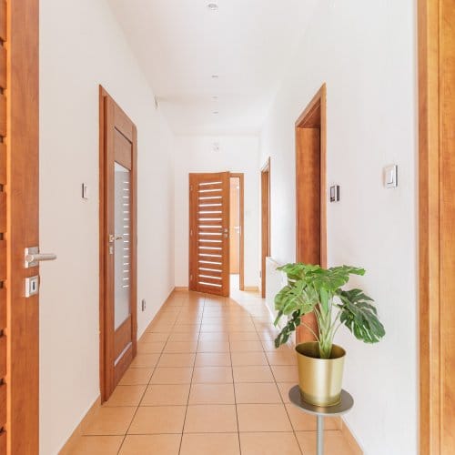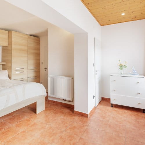 Dům je přízemní. Zatím. Pokoje jsou vzdušné a v interiéru máte k dispozici spoustu úložného prostoru včetně šaten, prádelny a sklepa. Dvě ložnice mají své vlastní sociální zázemí, malou koupelnu a záchod. Zkrátka soukromí nad soukromí.