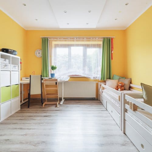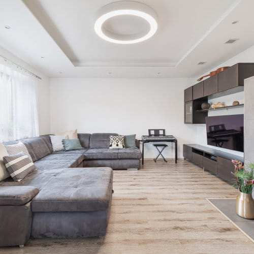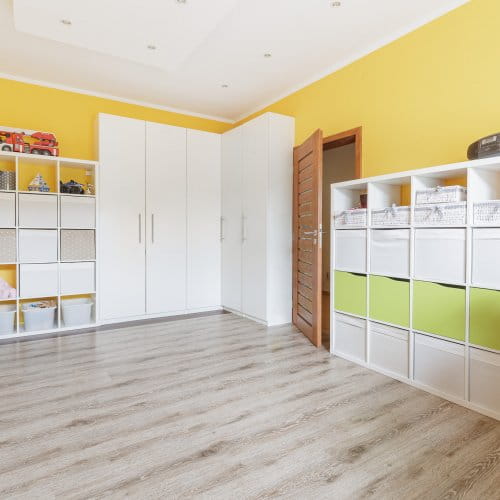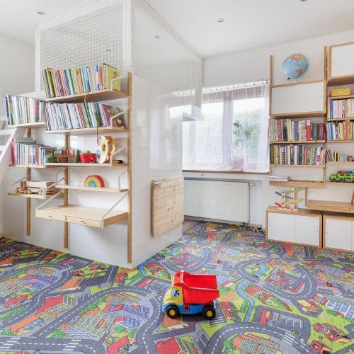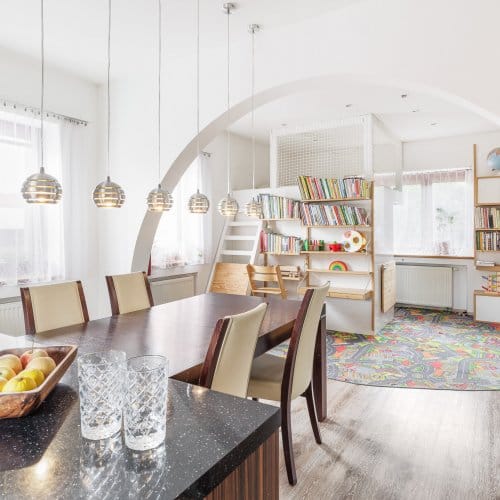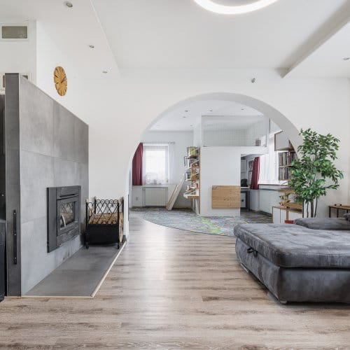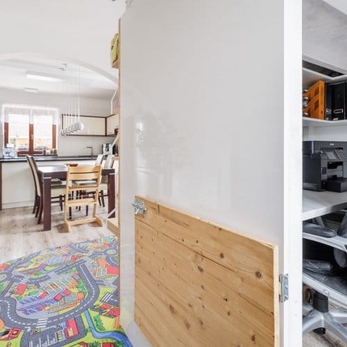 Zajímavostí, zvláštností a nejspíš i výhodou v jednom je propojení kuchyně, dětské herny (která ukrývá chytře pracovnu) a obývacího pokoje. Zde mohou i členové velmi početné rodiny trávit čas společně, aniž by si překáželi.