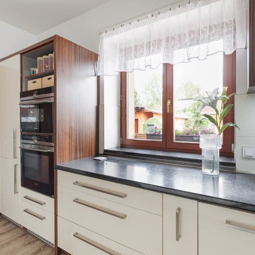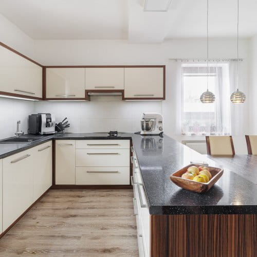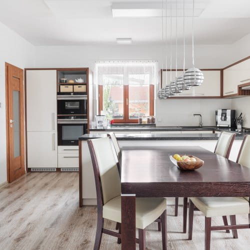 Nábytek je vestavěný, řešený většinově na míru, vybavení může zůstat na místě, pokud si to budete přát.
