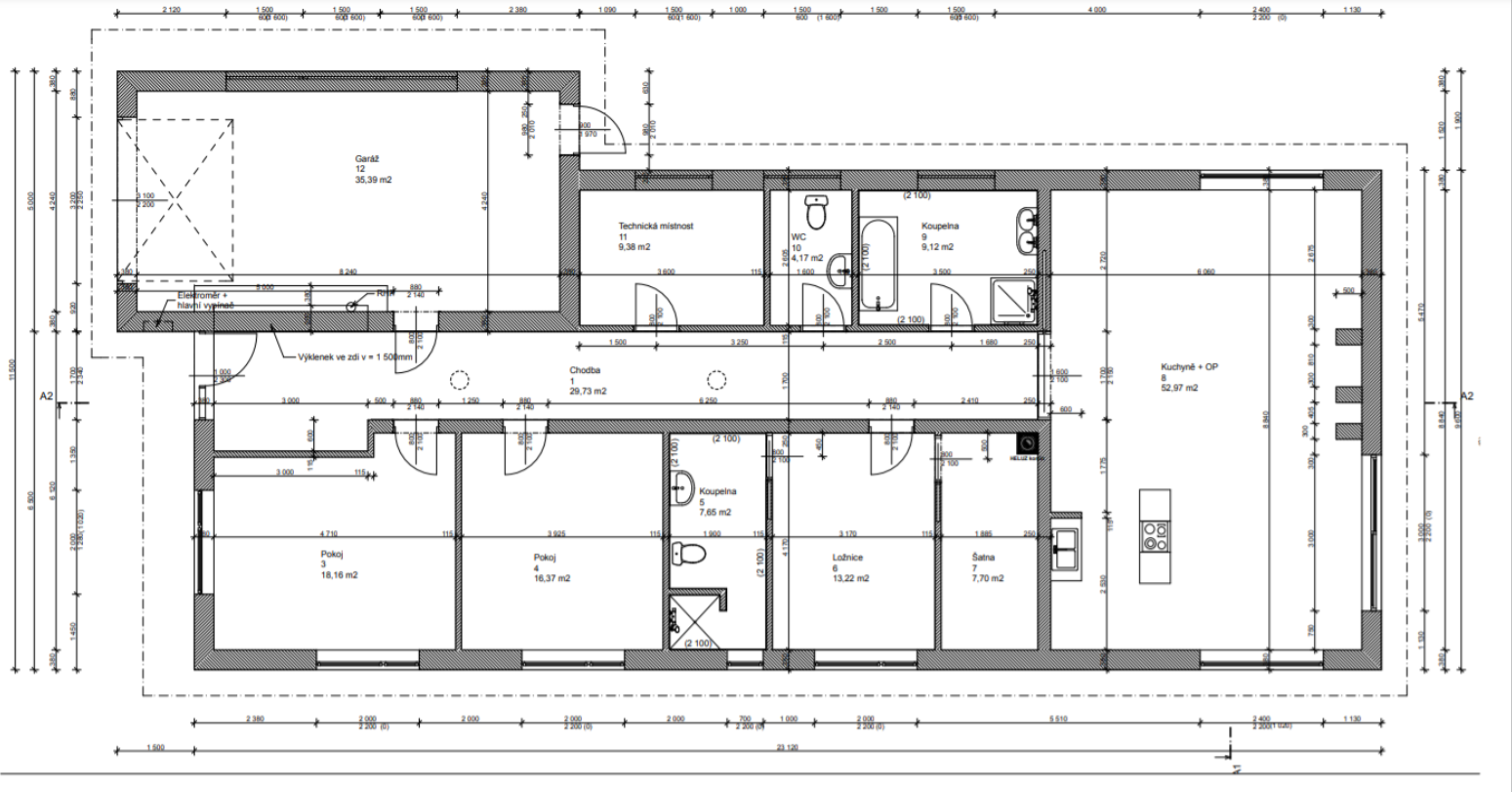 garáž 36 m2, technická místnost 10 m2.