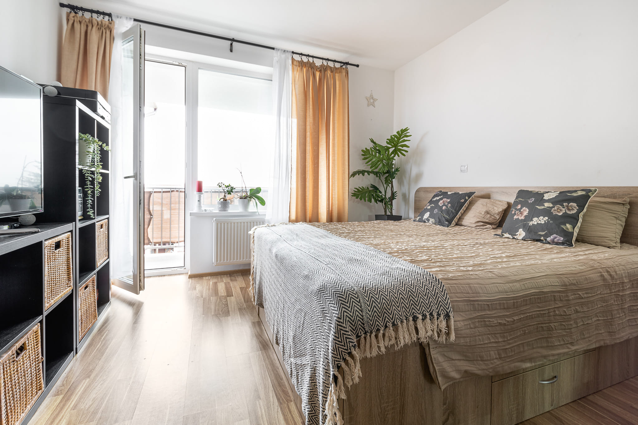 V bytě jsou plovoucí podlahy a dokonale sladěný nábytek na míru. Součást ceny je kompletní vybavení (věšáková stěna, vestavěná zrcadlová skříň, vybavená kuchyňská linka včetně spotřebičů, pračka, koupelnový nábytek, kotel, kompletní zařízení pokoje, policový díl, TV, postel na míru s úložným prostorem, matrace, bytový textil, osvětlení).