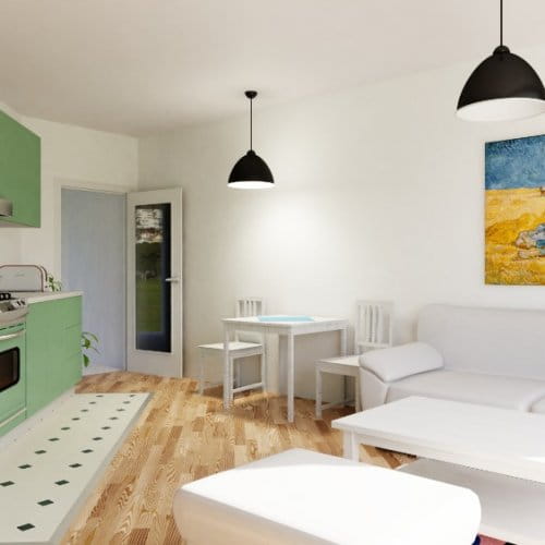 V ceně bytu je nová kuchyňská linka. V bytě je podlahové topení a při zařizování bytu nebudete muset počítat s omezením v podobě radiátoru.
