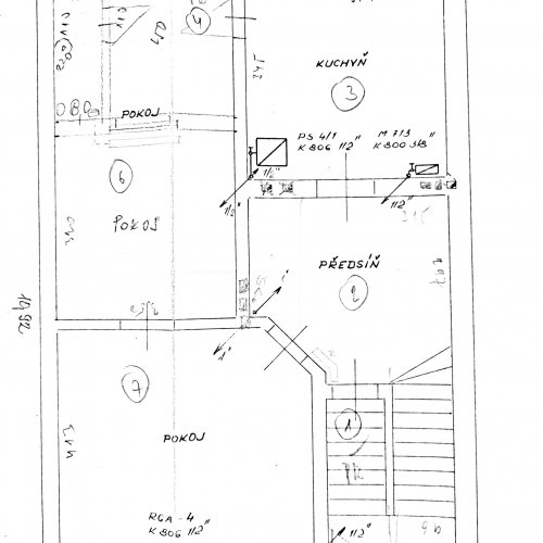 Přízemí 75 m2 – 2 pokoje 18 m2 + 7m2, kuchyně 11 m2, předsíň 10 m2, schodiště, wc 1m2, vstup ven na zahradu