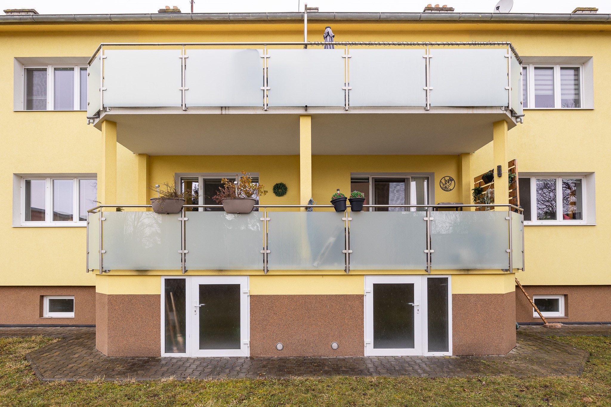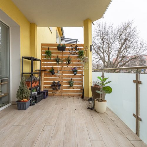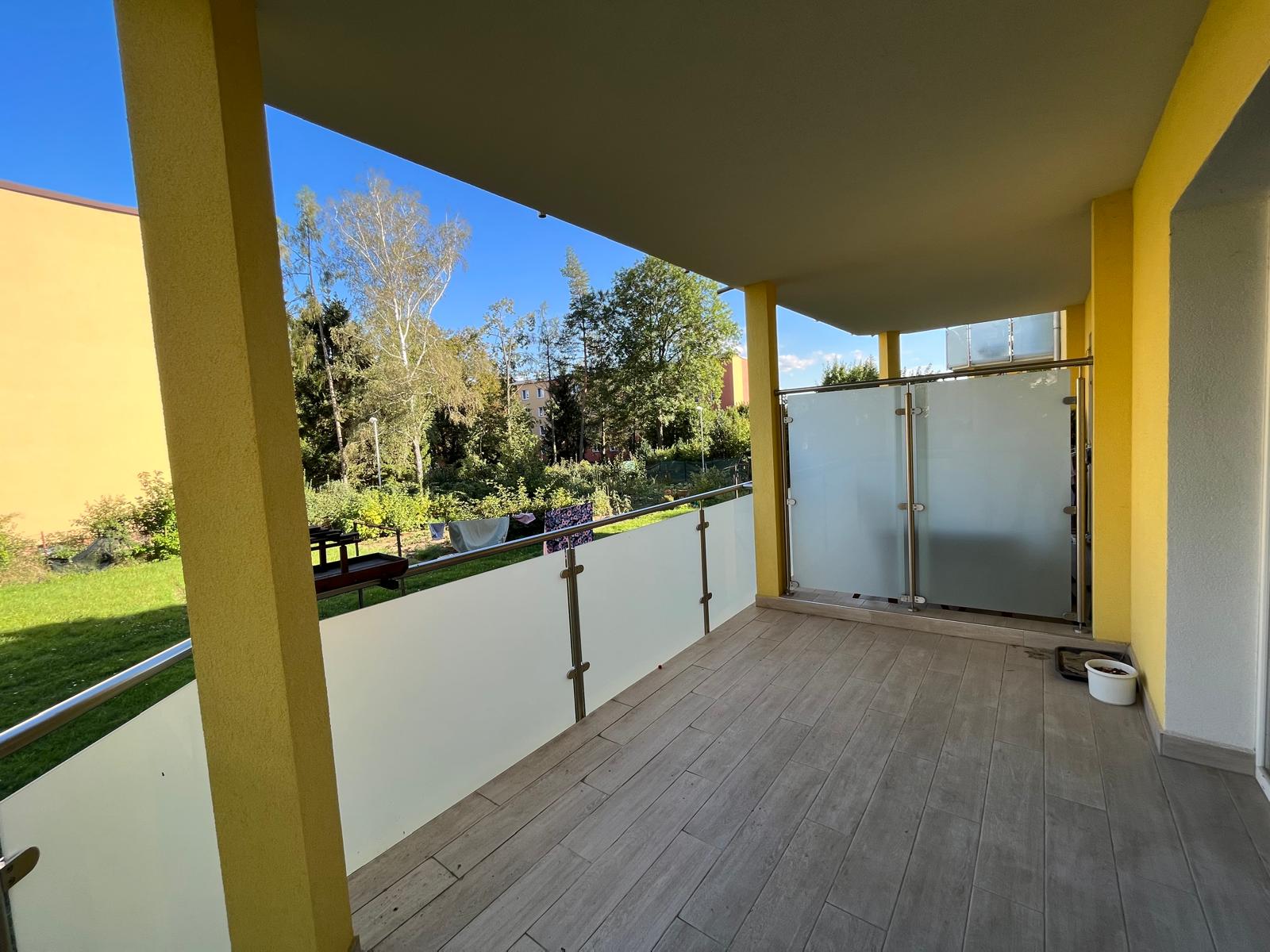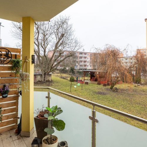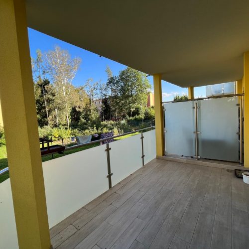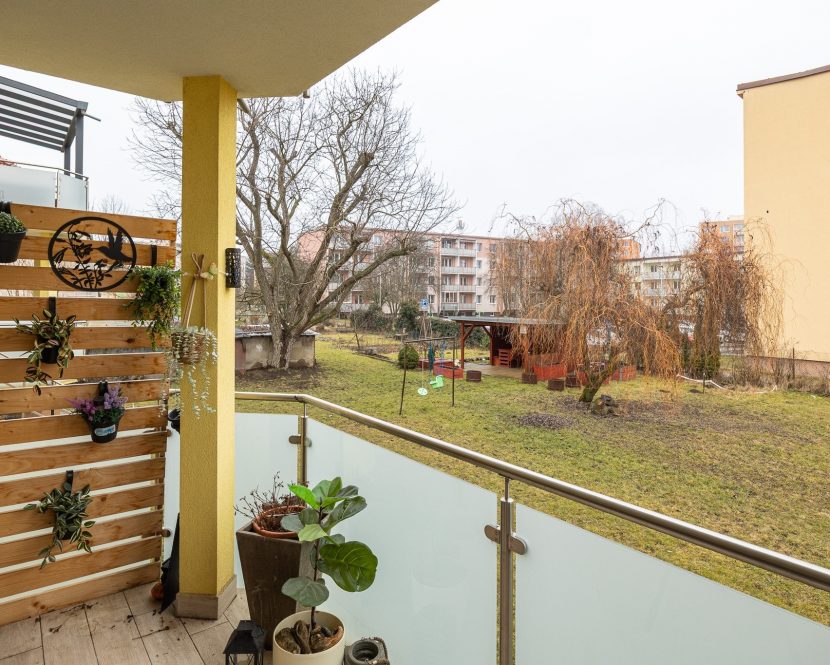 Velkou devizou bytu je krytá terasa. Je orientována do vnitrobloku, takže klid máte po většinu času zaručen. Pod terasou je prostor pro uložení všeho, co se nehodí nosit do bytu třeba kol nebo kočárku. K bytu náleží dva velké sklepy, jeden vybízí k zřízení například soukromé tělocvičny a do druhého uložíte sezónní věci, na které není v bytě místo.