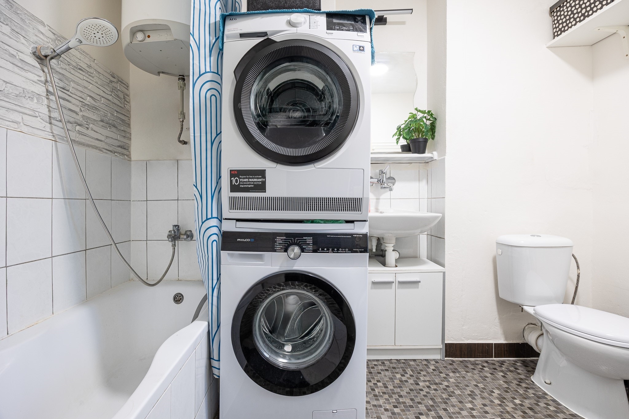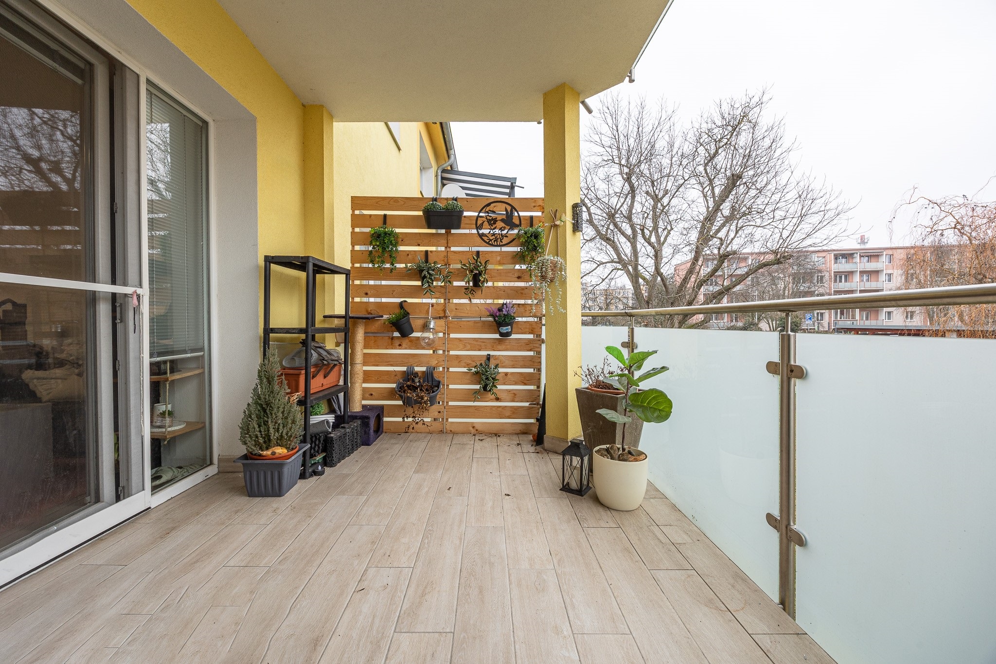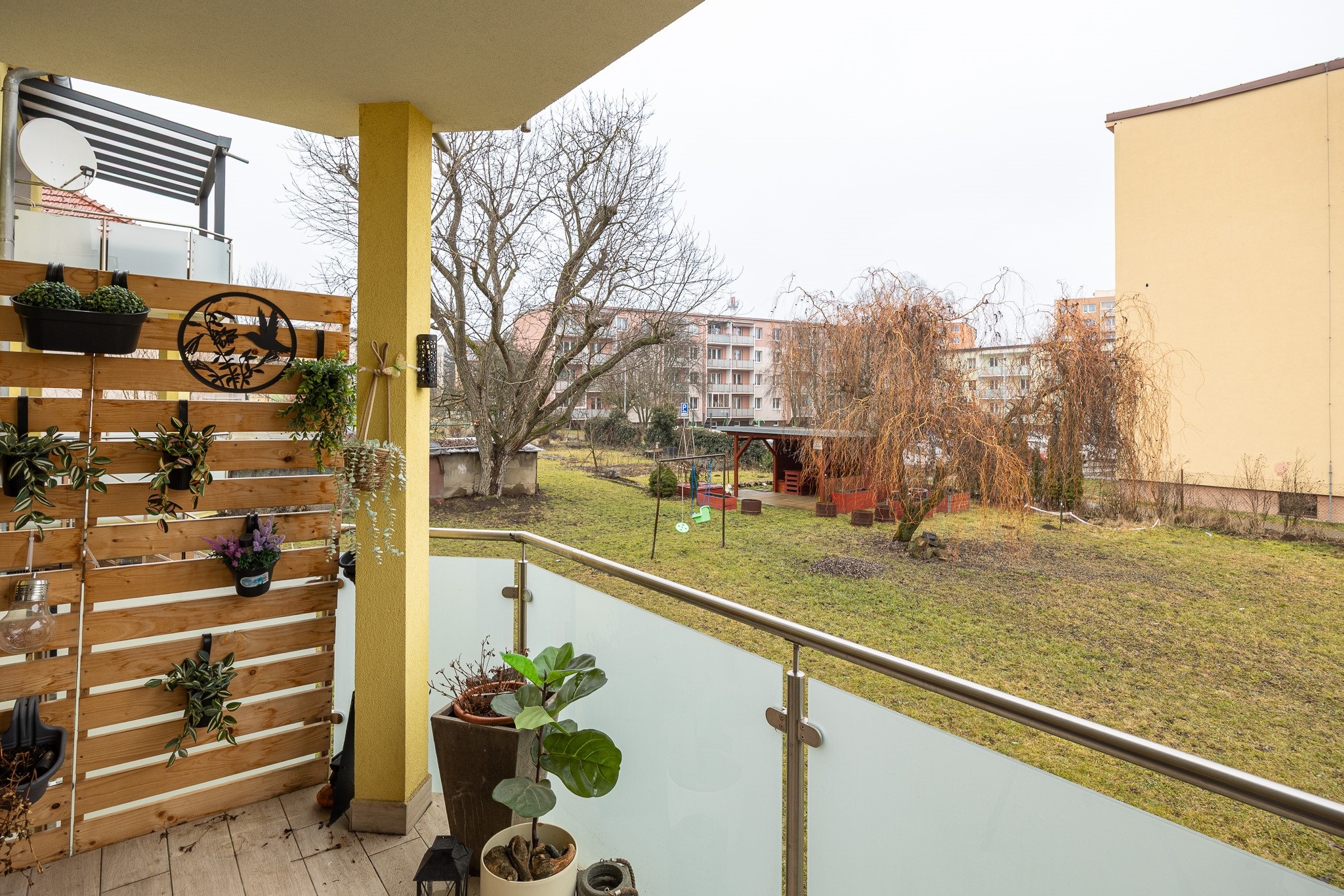 Velkou devizou bytu je krytá terasa. Je orientována do vnitrobloku, takže klid máte po většinu času zaručen. Pod terasou je prostor pro uložení všeho, co se nehodí nosit do bytu třeba kol nebo kočárku. K bytu náleží dva velké sklepy, jeden vybízí k zřízení například soukromé tělocvičny a do druhého uložíte sezónní věci, na které není v bytě místo.