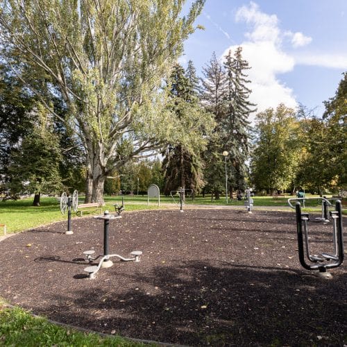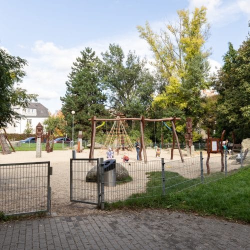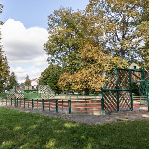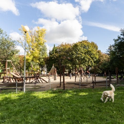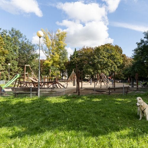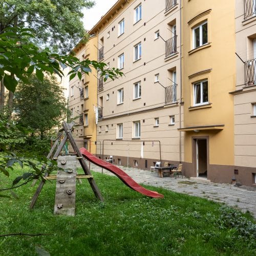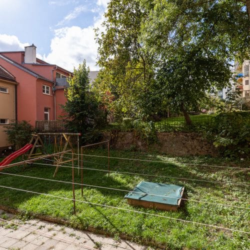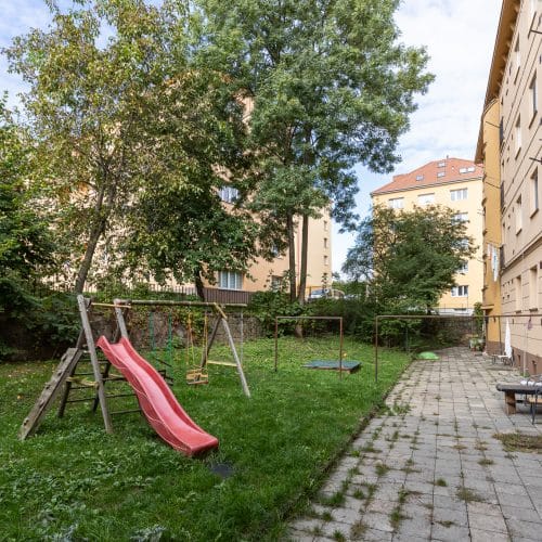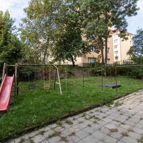 Zahrádka za domem ukrývá hřiště s pískovištěm, skluzavkou a množstvím průlezek. To činí z bytu ideální útočiště pro začínající rodinu.