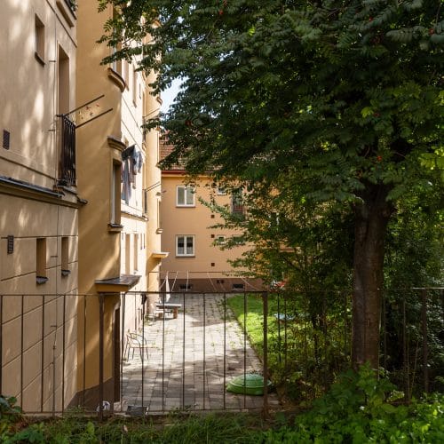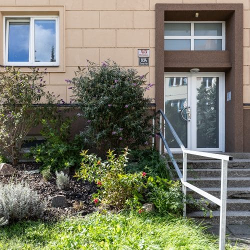 Byt se nachází ve zvýšeném přízemí. Toho se stran bezpečnosti nemusíte obávat, vstup do domu je po schodech a okna jsou tudíž dostatečně vysoko nad terénem.
